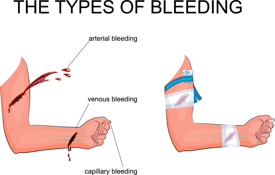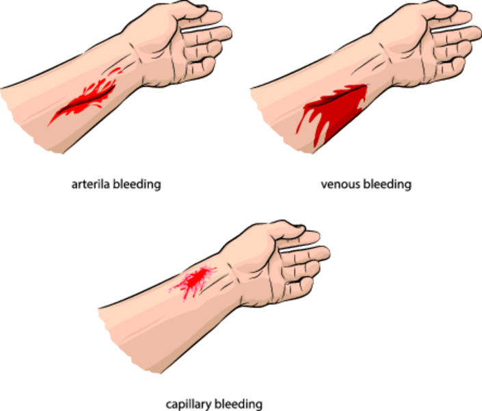 Капиллярное кровотечение неинтенсивное, кровь при нем выделяется по всей поверхности повреждения. При венозном она образует равномерную струю вишневой окраски. Ранение артерии проявляется сильной бьющей струей алой крови, пульсирующей в соответствии с сокращениями сердца. При смешанном повреждении видны признаки и артериальной, и венозной кровопотери.