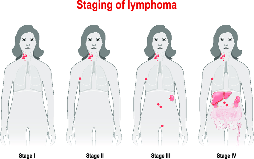 В зависимости от распространенности опухолевого процесса в организме выделяют 4 стадии лимфомы Ходжкина: