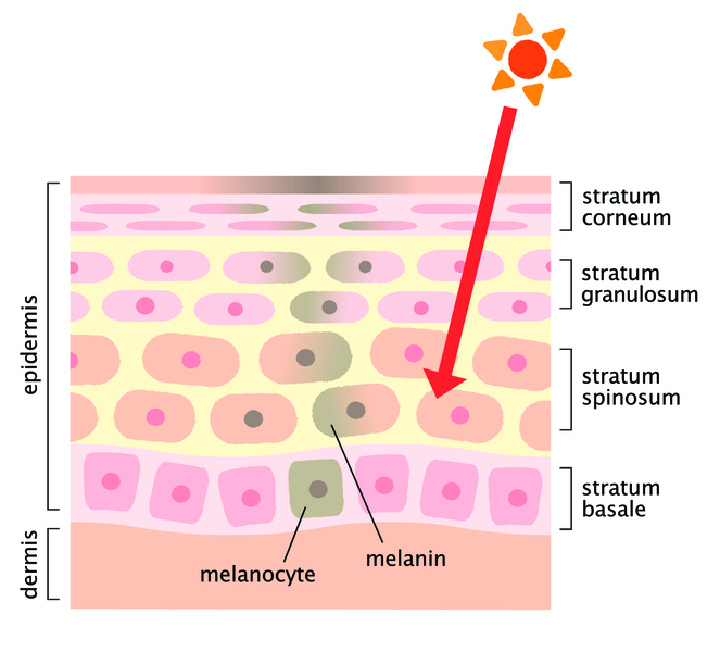 Пигмент накапливается в клетках эпидермиса, и его количеством определяется оттенок кожных покровов, цвет глаз и волос. Под воздействием ультрафиолетовых лучей в нижних слоях кожи синтезируется большее количество этого пигмента, и она покрывается загаром.