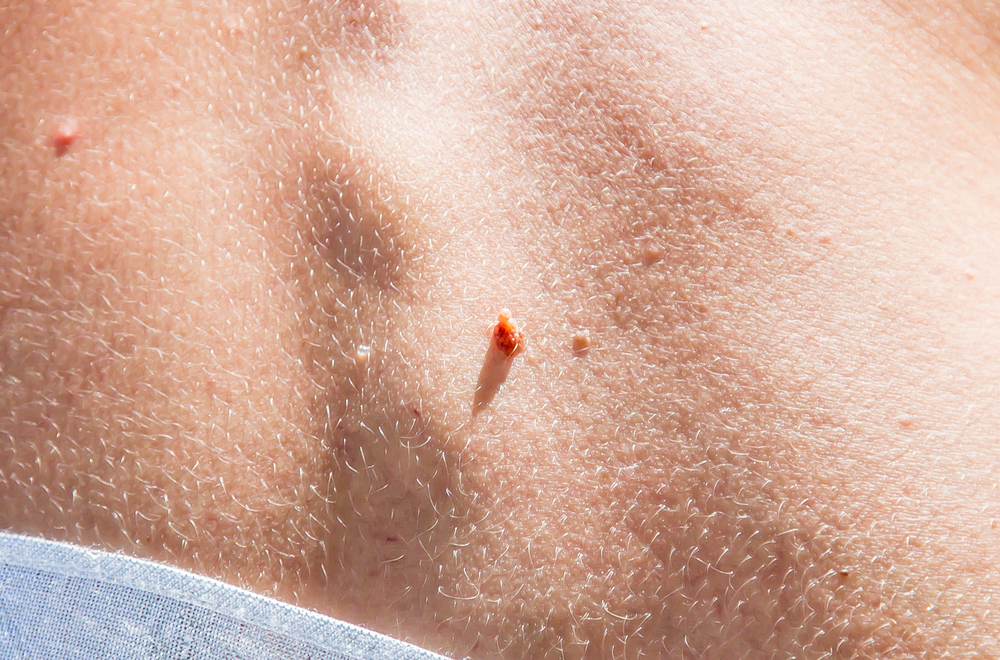 - мелкие нитевидные бородавки: локализуются на лице, шее, в подмышечных областях и паховых складках; имеют вид тонких сосочков на ножке, на конце могут иметь расширение; цвет – обычной кожи или с легким розовым оттенком; если они подвергаются трению одеждой, то могут самостоятельно отделиться с появлением капли крови на этом месте;