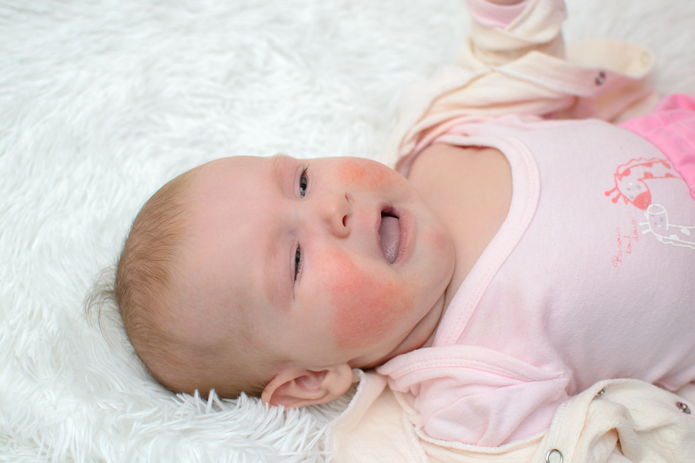 1. Но чаще всего розовые и шершавые щеки и ягодицы могут оказаться проявлением атопического дерматита (устаревшее название этого состояния – «экссудативный диатез»). Он может проявляться в виде сухих шершавых пятен на разных участках тела. Это заболевание аллергической природы, выражающееся в реакции кожи на воздействие различных аллергенов.